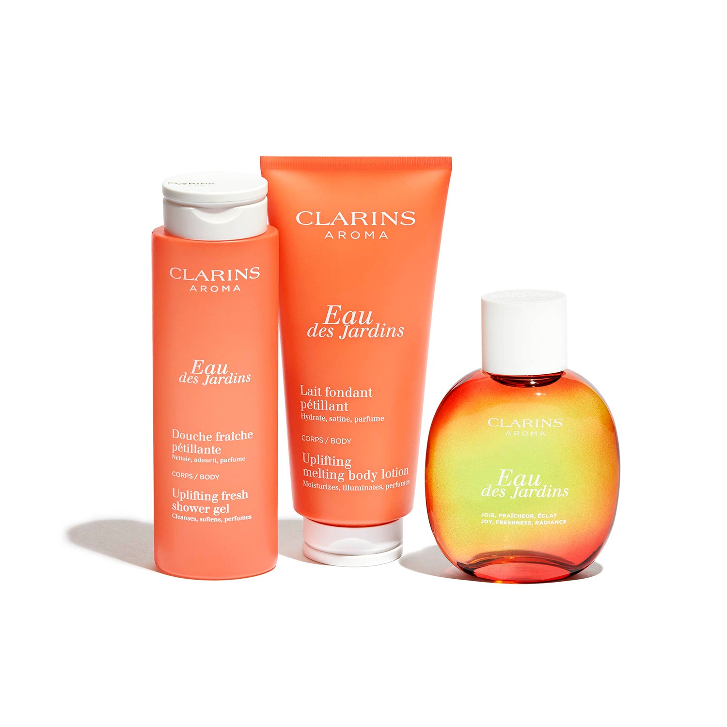 L’Acqua di Trattamento Clarins dal profumo inebriante che si prende cura della pelle e dello spirito. L’iconica Eau Dynamisante Clarins si declina nella floreale e frizzante Eau des Jardins. Quest’Acqua di Trattamento, composta al 93% da ingredienti di origine naturale, profuma e risveglia una sensazione di gioia. Ideale per allontanare la tristezza e darti la carica fin dal mattino. Le note di testa di scorza di limone, arancio e pompelmo avvolgono la pelle di freschezza. Seguono poi le note di cuore, di alloro, mentastro verde e geranio che, abbinate alle note riequilibranti del cedro, donano una piacevole sensazione di gioia e leggerezza. L’estratto di germoglio di sorbo bio illuminante è abbinato all’estratto di germoglio di ribes nero bio dalle proprietà lenitive, per una pelle radiosa. Il flacone verde rende omaggio alla natura.